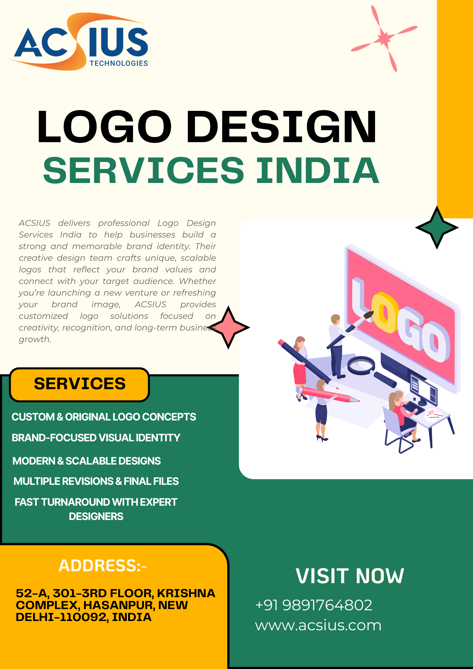 ACSIUS offers professional Logo Design Services in India to help businesses create distinctive, memorable brand identities. Their creative designers focus on crafting unique, scalable logos that reflect your brand values and resonate with your target audience. Whether you’re launching a new business or rebranding, ACSIUS delivers customized logo solutions designed to strengthen brand recognition and support long-term growth.