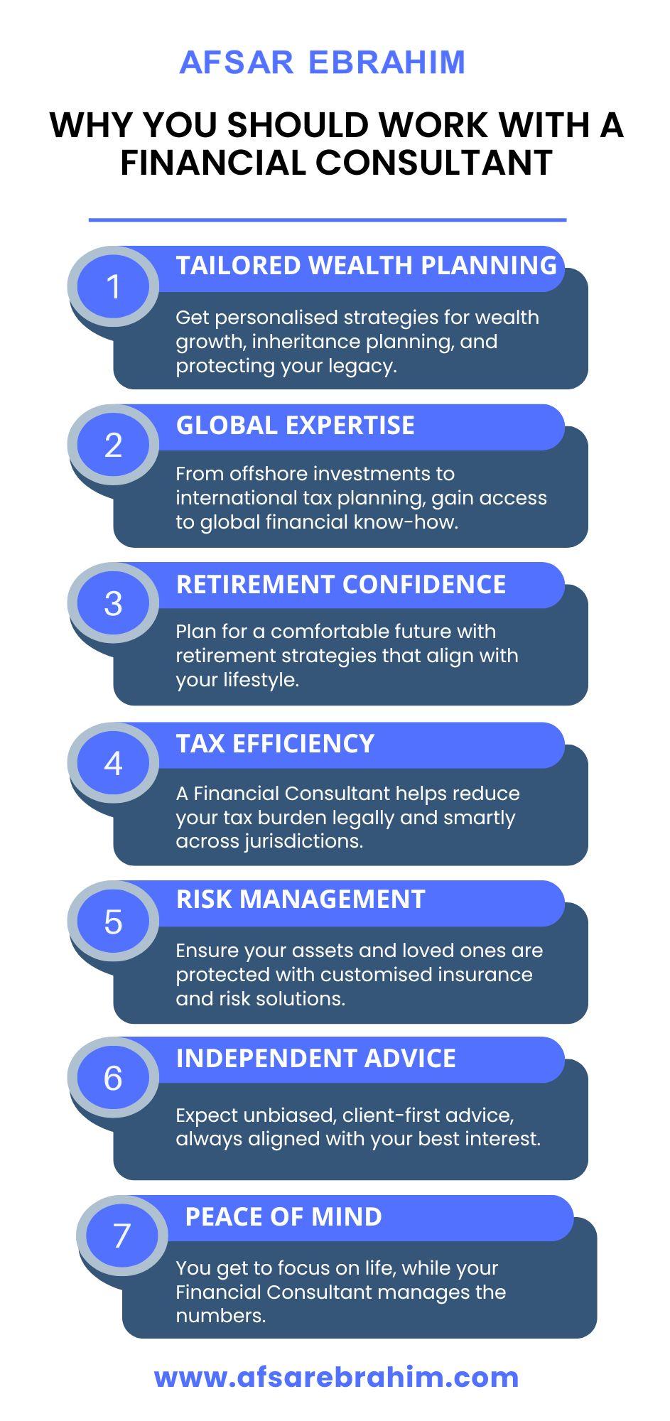 Working with a Financial Consultant like Afsar Ebrahim can help you make smart choices with your money. A consultant gives expert advice on saving, investing, and planning for the future. With the right guidance, you can grow your wealth, avoid mistakes, and reach your goals faster while feeling confident about every financial decision.