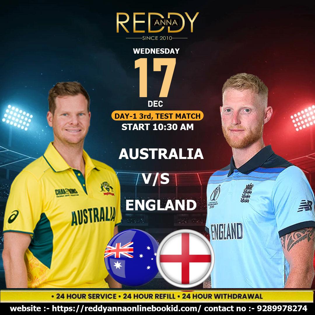 Catch all the action of Day 1 in the 3rd Test Match between Australia and England with Reddy Anna Online Book ID. Live updates on scores, over-by-over actions, major sessions, and performance of key players will come from Adelaide Oval.